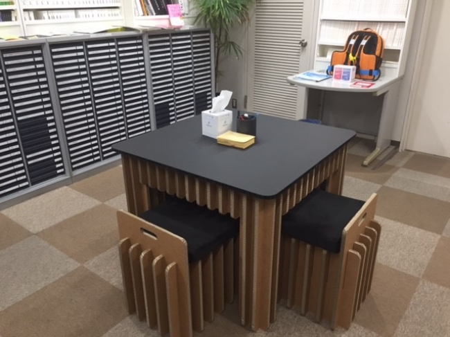サインボード、展示台、テーブル、椅子、リーフスタンドなどを強化段ボールで製作。紙を扱う会社のショールームだからこそ、紙製にこだわりました。