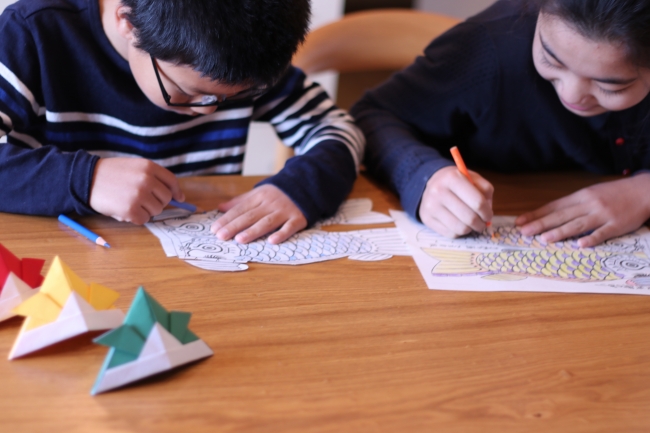 ワークショップでは、行事の由来のお話の後に、江戸商人たちが競って上げたという、和紙のこいのぼりを作ります。自分だけのオリジナルこいのぼりを仕上げたら、菖蒲やよもぎを使って薬玉(くすだま)のしつらいも。