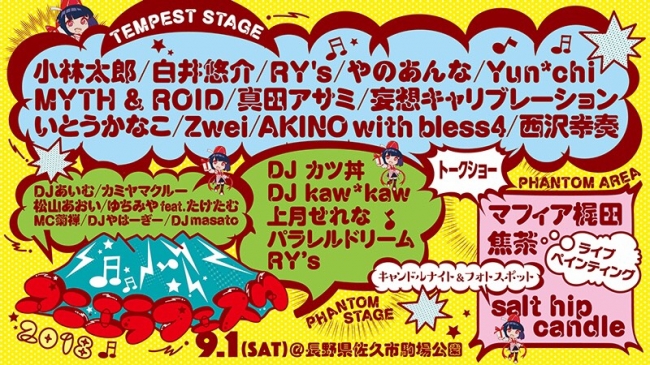 小林太郎/白井悠介/RY's/やのあんな/Yun*chi/MYTH & ROID/真田アサミ/妄想キャリブレーション/いとうかなこ/Zwei/AKINO with bless4/西沢幸奏/マフィア梶田(トークショー)/焦茶(ライブペインティング)、他多数!信州の大自然の中で、アニメと音楽を満喫しよう!