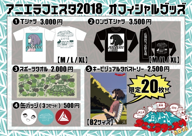 出演アーティストの名前が印字された公式フェスTシャツや、アニエラフェスタ2018モデルのタオル、キービジュアルのタペストリーなど、豊富なアイテムが盛り沢山です!普段使いを念頭に置いたオシャレなデザインが魅力的!