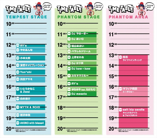 無料のファントムステージでは10時50分からDJによるライブがスタート!有料のテンペストエリアでは12時からライブがスタートします。その他、イラストレーター「焦茶」によるライブペインティングや「マフィア梶田」トークショー、コスプレイベント『acosta!』とのコラボ企画『acosta!×アニエラフェスタ』など!多数のコンテンツが同時開催!どのエリアでどんな楽しみ方をするかは、その人次第!自由にフェスを楽しもう!