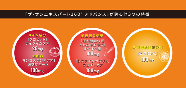 2018年に誕生した『ザ・サンエキスパート』は国内発売以降、最新美容成分3種を高濃度で追加、価格の見直しなど次々と改良を重ね、今回発売となる新製品『ザ・サンエキスパート360° アドバンス』は適糖生活サポート素材「マンゴスチンアクア」※を新配合、エイジングサポート強化、栄養機能食品取得、再度の価格見直しなど、 品質効果を高めてきました。
