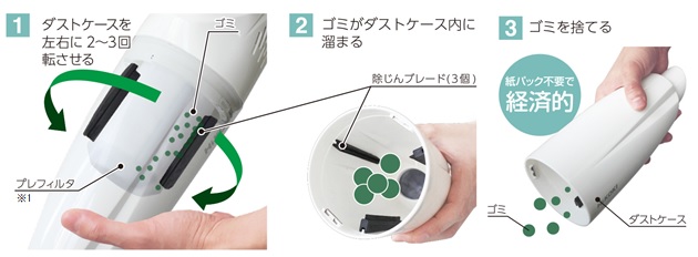 また、ダストケース集じん方式により、集めたゴミはダストケース内に留まります。紙パックが不要でより経済的になり、スピーディーにゴミ捨てを行うことができます。またダストケースは女性の方でも握りやすい細径(Φ102)で、ダストケースを回転する動作がしやすくなっています。