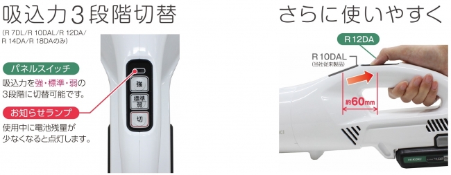 また、強・標準・弱の3段階に吸引力の切替えが可能なパネルスイッチにより連続作業がし易くなったほか、パネルスイッチの位置を手元に近づけたことで手の小さな女性でもハンドルを握ったまま片手で操作がし易くなっています。