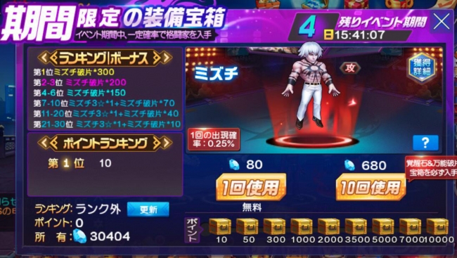 LR格闘家ミズチを含む豪華アイテムがランダムで当たる装備ガチャ「装備宝箱・ミズチ」を期間限定で開催いたします。ガチャ10回ごとに「覚醒石」と「万能破片の宝箱」を獲得可能で、1日1回まで無料でガチャを利用できます。また、ガチャを利用する毎に10ポイントを獲得し、イベント終了時点のポイント数ランキング30位以内にランクインしたお客様には下記の通りミズチ[破片]を配布いたします。