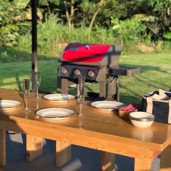 SUNNY TACOSと併設する「OKINAWA BBQ GARDEN」。地元中心にした厳選食材を予約制で楽しめます。アメリカ製の高級バーベキューグリルを使用し、地元ならではの食材を自ら調理し、道具や食材調達、後片付けの必要ない手ぶらでバーベキュースタイル。島野菜やあぐー豚、やんばる地鶏の他、観光客に大人気のブルーシールアイス、SUNNY TACOSで提供しているタコス生地もメニューイン。ソフトドリンクのフリードリンク付きでオリジナルのレモネードも含まれているお得なメニューです。