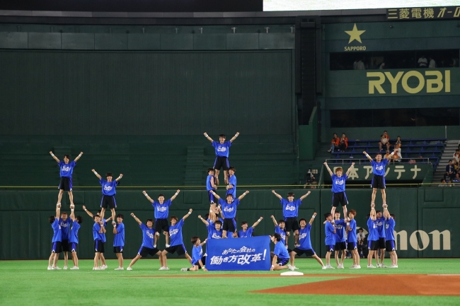 始球式イベントでは、冒頭で今回の始球式のために作られた「働き方改革 始球式 VTR」が流れた後、明治大学の男子チア「ANCHORS」の皆さんにパフォーマンスを披露いただき、会場の観客も松木さんも釘付けとなりました。