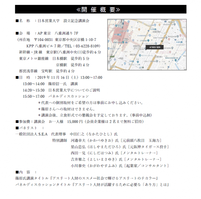 また、当日はアスリートのもつ特性と現状、日本営業大学の活動について会社経営者・人事担当者向けの説明会・パネルディスカッションを同時開催いたします。