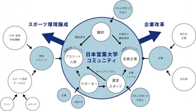 日本営業大学とはアスリートと企業のマッチングに加えて、[アスリート→ビジネスパーソン]になるためのビジネス教養を身に着けるプログラム教育を実施し、就職したあとも企業側・アスリート側双方と関係を持ってフォローしていくという【教育・就職・定着】を目指した日本初の団体です。