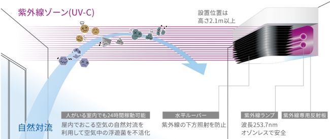 エアロシールドは紫外線の中でも最も効果が高いとされているUV-Cを上部に照射し、自然対流により空気が循環することで、人がいる空間でも24時間365日安心・安全に空気環境対策ができる製品です。
