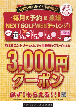 <概 要>:公式ウェブサイト「NEXT GOLF WEB」にてご予約の上、4月、5月、6月の各月に1回以上3カ月連続でご来場いただいた予約代表者さまへ、もれなくNXのゴルフ場で利用できる3,000円のクーポンを差し上げます。