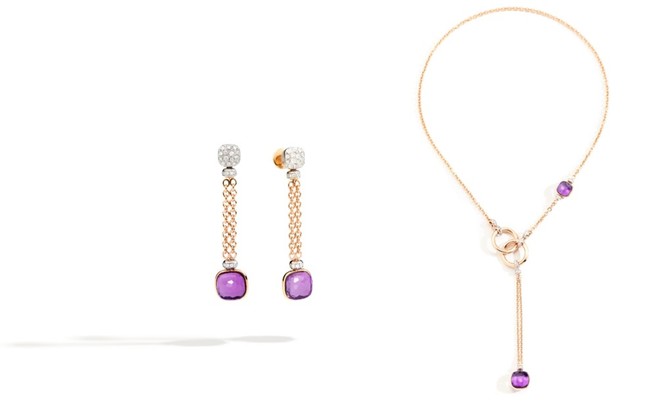 リングとのコーディネートでも、またはパリュールとしても合わせられ揺れるアメシストイヤリングは、ダイヤ モンドパヴェが輝くローズゴールドチェーンにあしらわれ揺れます。ダイヤモンドパヴェをあしらった2つのアメシストの 「ヌード」ラリアットネックレスのクラスプはデザインに自然と溶け込みます。