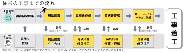- 従来の住宅塗装工事では人と人とが接して打ち合わせを行う対面式でしたが、WEB打ち合わせシステムはあらかじめ用意されたフォームに顧客の要望を入力し、現地調査で要望の可否を判断、見積書提示等により確定させることで外壁デザインや、見積もり内容の修正、個々に異なる建物の工事仕様などのさまざま打ち合わせを非対面で行うことが可能となり、新型コロナウィルス感染防止の対策として有効となります。