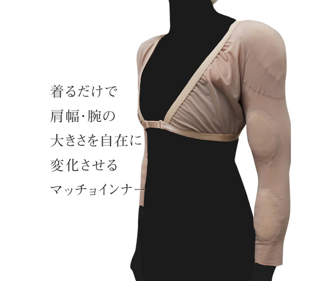 今回新たに発売する『マッチョインナー』は、ユニセックスのフリーサイズ。その名の通り、男性が更に男性らしさを極めるために、女性のカラダを男性らしく演出できるよう、広い肩幅としなやかな腕の筋肉を表現した特殊インナーです。着用方法は驚くほど簡単で、腕を通してフロントフックを留めるだけ。クロスドレッサーやコスプレイヤー、レインボーの方から支持をいただく当ブランドですが、新商品『マッチョインナー』は、ビジネスシーンでの第一印象さえもバージョンアップできそうな変身スーツです。