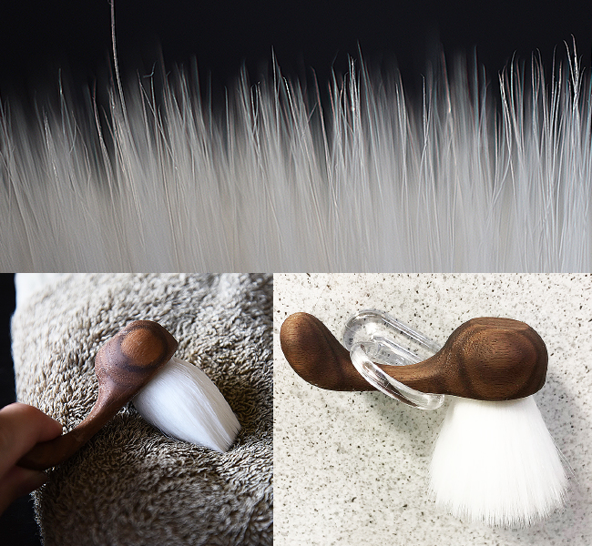 当社の従来商品(シェービングブラシ、洗顔ブラシ)は、肌触りが良く、泡立ちの良い、動物の毛(山羊など)を使用していました。しかし、動物の毛は特に水を濡らすと臭いが気になる、乾きにくい、耐久性が良くないというデメリットがありました。その問題を解決し、肌触り・泡立ちの良いブラシを作りたい。そんな思いを元に光文堂が培ったノウハウと熊野筆の技術で作り上げた洗顔ブラシです。
