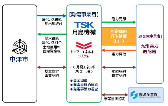 本事業は、企業グループが中津市から事業用地の提供を受けるとともに、下水処理場で発生する消化ガス(バイオガス)を中津市から購入し、20年間の発電事業を行うものです。企業グループが有するファイナンス機能や事業運営ノウハウを活用して発電設備を建設し、発電した電気は、「電気事業者による再生可能エネルギー電気の調達に関する特別措置法」に基づく固定価格買取制度(FIT)を利用して、電気事業者に売却します。