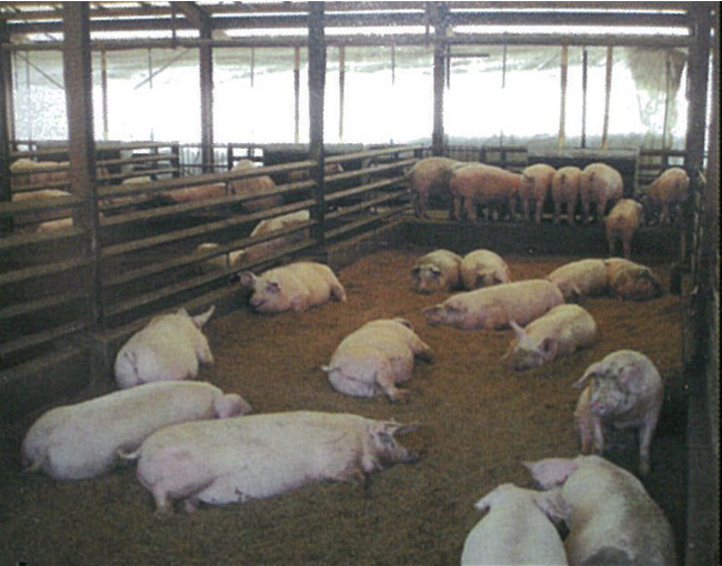 - おがくずと籾殻をひきつめた衛生的な発酵豚舎