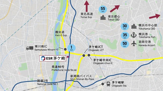 茅ヶ崎DCは首都圏中央連絡自動車道(圏央道)の「寒川南IC」から約1kmと至近で、新東名高速道路、東名高速道路、新湘南バイパスの連結点にも近く、首都圏全域、東海・関西地方への配送が可能で、特に小売業界や増大の一途をたどるe-コマースの高いニーズに対応できる物流拠点として好立地です。さらに2025年に開通予定の圏央道・横浜環状南線(戸塚IC~栄JCT~釜利谷JCT)により横浜横須賀道路および「並木IC」で首都高速道路湾岸線にも直結するため、横浜港からのアクセスも格段に向上します。