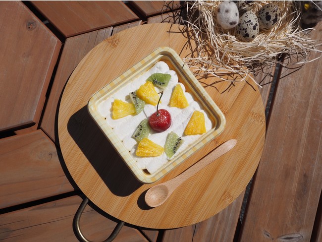 う玉弁当うずらの卵カステラの上に生クリームと季節のフルーツをのせたお弁当風スイーツ。