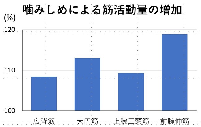 背中、腕などの筋活動量が約7~19%も増加することもわかっています。噛みしめると、体が安定するのでバランス能力が良くなる上、頭部も安定し視線が安定します。