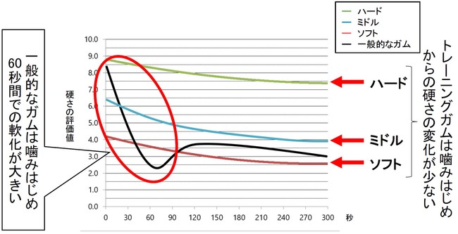 一般的なガムは、噛んでいくにつれて、硬さが大きく変化するのに比べ、アスリート専用トレーニングガムは、噛みはじめからの硬さの変化が少ない特別な設計となっています。