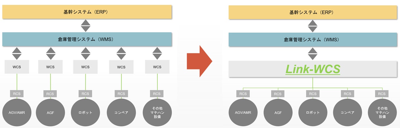 WCS(Warehouse Control System/ 倉庫制御システム)とは、倉庫内の設備を制御することに特化した ITシステムのことをいいます。LinK₋WCS は、上位システム( MES/WMS )と自動化設備のインターフェースの役割を果たし、上位システムの情報をもとに、複数のロボットや設備を総合的に遠隔制御して、効率の良い運用を可能にした、「統合WCS」です。
