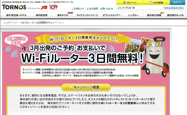 本キャンペーンでは、トルノスで3月出発の海外旅行を予約された方のうち、先着200台限定で、「Wi-Ho!」のデータ通信料金3日間を無料で提供いたします。