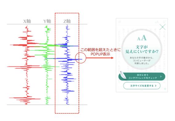 スマートフォン等のデバイスが、ある一定を超えたZ軸方向(手前・向こう側)の動きを感知した際、読みやすさのための手元調整が行われたと判断して、POPUP表示を行います。誤検知を防ぐため、読書の冒頭5秒間だけ作動します。