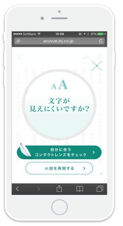 「1-Day小説」特設サイトでは、瞬間加速度装置対応スマートフォン専用のビューワー「キャリアアイ・チェッカー」を用意しました。スマートフォンで読み手側が「読む対象の手元を調整する動き」を感知して動作します。「1-Day小説」のようなスマートフォン上に表示されるテキストが見づらい場合に、端末を自分の顔から遠ざけるなど、見やすい位置に調整する動きを感知した場合にポップアップ表示を行います。これにより、遠近両用コンタクトレンズ等の必要性を簡易に認識いただけるようにしました。