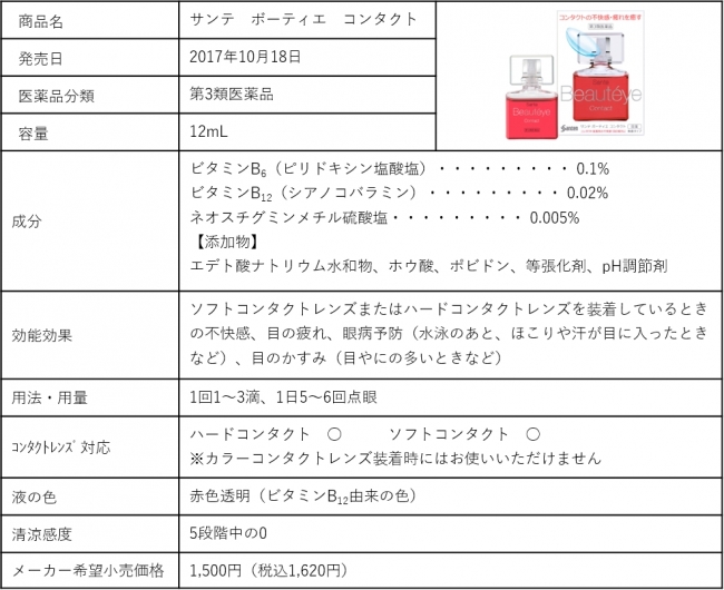 「サンテ ボーティエ」(従来品)は2013年の発売以来、美容感度の高い女性を中心に人気を博しており、ユーザーのコンタクトレンズ装用率は42.1%と、OTC目薬ユーザー平均の34.2%と比較して高くなっております(※)。ユーザーの皆様から数多くのご要望を頂き、このたびソフトコンタクトレンズ対応製品を発売することとなりました。日中、ソフトコンタクトレンズを装着している方でも使用できます。
