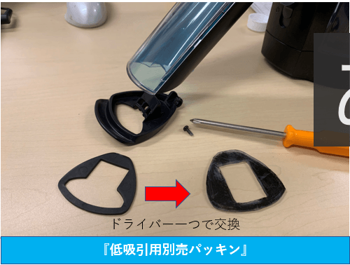 1. 水洗いクリーナーヘッドスイトルの吸い込み口のパッキンを交換するだけで吸引力が増す『低吸引用別売パッキン』の開発。