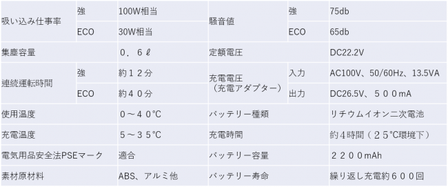 ローコストハイスペック/強吸引吸込仕事率100W相当、連続運転12分、軽量2027g