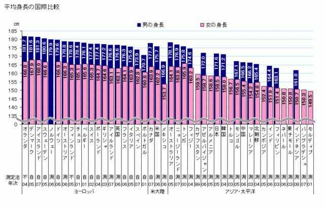 ・日本人は欧米に比べ背が低い出典:社会実情データ図鑑より