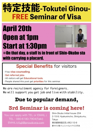 4月20日(土)に新大久保の弊社オフィスで特定技能ビザに関するセミナーをします。