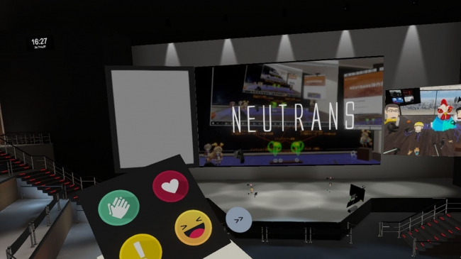 NEUTRANSは、会議室やセミナールームといった空間をインターネット上に構築し、複数人のユーザーがPC用のVRヘッドマウントディスプレーをかぶって参加して、コミュニケーションできるというツールです。VRヘッドマウントディスプレーは「Oculus Rift」や「HTC VIVE」に対応し、さらにヘッドマウントディスプレーを持っていないユーザーもPCの画面で視聴可能です。