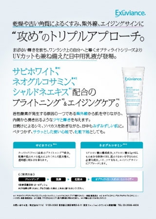 ドクターズコスメ エクスビアンスの中でも、まばゆい輝きを放ち、ワンランク上の自分へと導くブライトニング*1ケアシリーズ「オプティライト」より、ブライトニングケア・エイジングケア・UVカットのトリプルケアが叶う日中用乳液「オプティライト・スポット・ミニマイザー SPF25」が日本上陸。乾燥や古い角質によるくすみ、紫外線、エイジングサインに攻めのトリプルアプローチを行います。