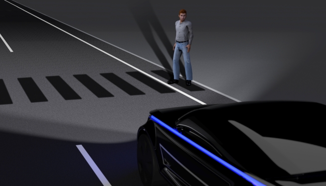 また「高解像度ヘッドランプ」により、ロービームでの路面に記号や絵を表示し、例えば、路面上に進行方向を矢印で投影する、車幅を示すラインを表示し狭い道でのすれ違い時の運転操作を補助する、などの多彩な運転者アシストが可能になります。また、「横断歩道」の形状を路面に表示して歩行者に安全に渡れることを伝える歩行者アシストの機能も提供できます。