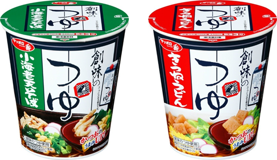 「創味のつゆ」の上品でまろやかなかつおの風味とうまみをカップ麺のつゆに活かし、風味豊かなそばに小海老天を合わせた「小海老天そば」、つるみのあるうどんときざみ揚げを合わせた「きつねうどん」の2品が新たに発売されることとなりました。いずれもかつおのうまみを強調した、風味豊かな味わいのうどんとそばになっております。