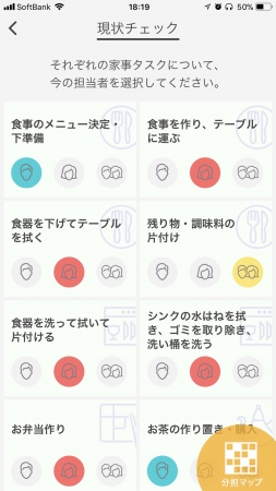 家族構成ごとに用意された家事タスクについて、担当者を選択していくと、現在の分担状況をマップ形式で見ることができます。