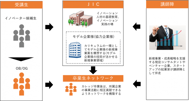 JICは、企業にイノベーションを興すイントレプレナーの基礎教育の場であると同時に、モデル企業に対する新規事業・新ビジネスを提案する実践の場 でもあります。学んだことを学んだままにせずに、実際の企業に対する提案・提言まで行うことで、臨場感・緊張感あるカリキュラムを実現します。