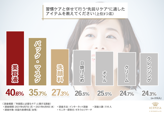 そこで、「習慣ケアと併せて行う“先回りケア”に適したアイテムを教えてください(上位3つ迄)」と質問したところ、『美容液(40.6%)』と回答した方が最も多く、次いで『パック・マスク(35.7%)』『洗顔料(27.3%)』『日焼け止め(26.5%)』『オイル(25.5%)』『クリーム(24.7%)』『クレンジング(24.3%)』と続きました。