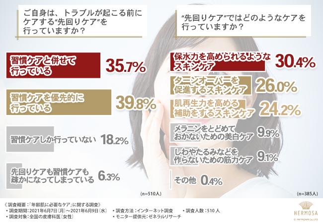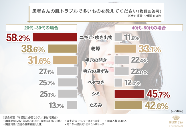 そこで今回、化粧品ブランド『HERMOSA』(https://hermosa-official.com/index.html)を手掛けるPAPパザパ株式会社は、全国の皮膚科医(女性)を対象に「年齢肌に必要なケア」に関する調査を実施しました。