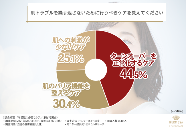 「肌トラブルを繰り返さないために行うべきケアを教えてください」と質問したところ、『ターンオーバーを正常化するケア(44.5%)』『肌のバリア機能を整えるケア(30.4%)』『肌への刺激が少ないケア(25.1%)』という結果となりました。