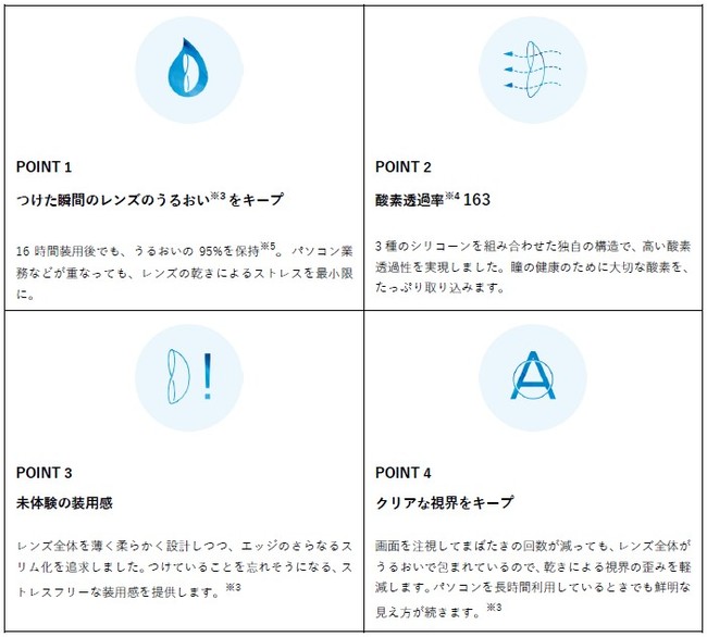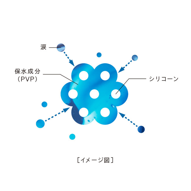 うるおい成分でシリコーンを包み込むことにより、レンズ全体の保水力がアップ。レンズの乾きを最小限にとどめ、目への張り付き、ゴロゴロ感を抑えます。