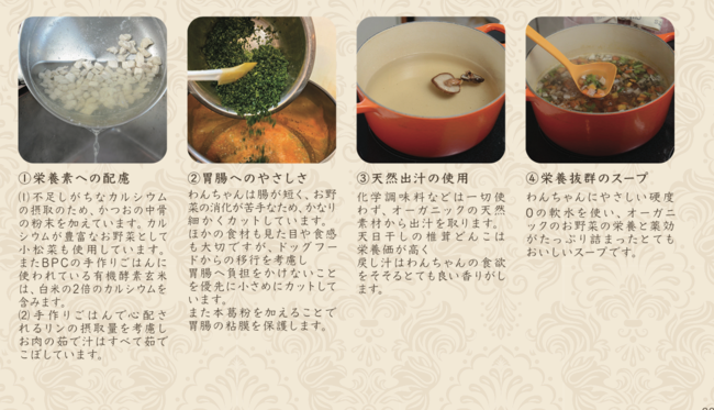 栄養価が高く安心なオーガニック=BIOの食材を100%使用し、スープたっぷりの水分量でわんちゃんの代謝不良を改善し、身体の中からキレイにする特別な手作りごはんです。