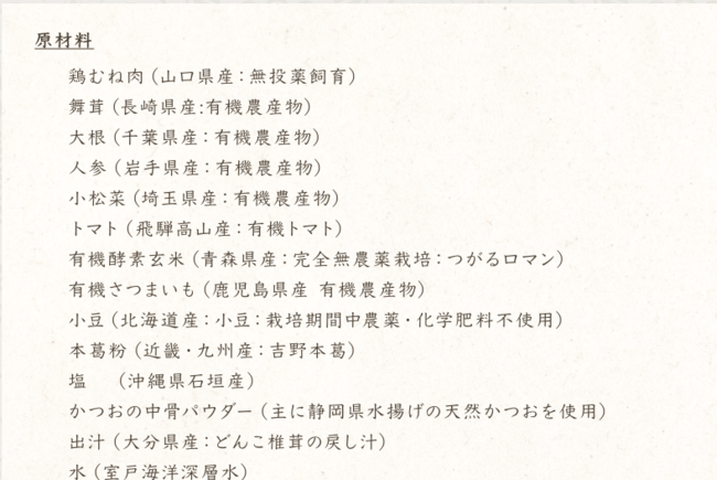 お出汁から始まり、使われている全ての食材が国産オーガニックとなり、安心して与えていただけます。
