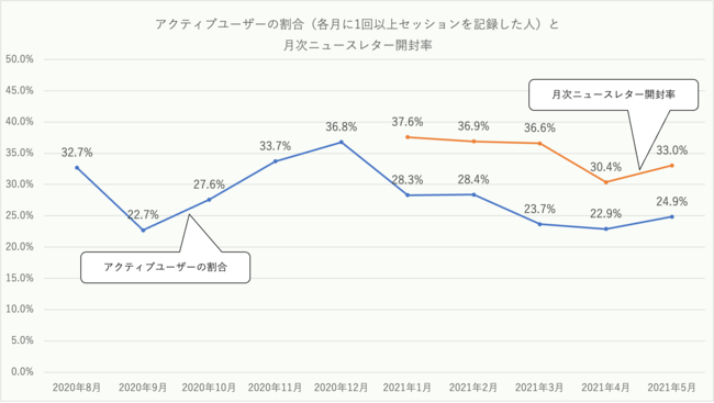 その結果、2020年8月の全面リニューアル以降、平均28%のアクティブ率(月間アクティブユーザー数)、月次のニュースレターについては毎回30%を超える開封率を実現しています。