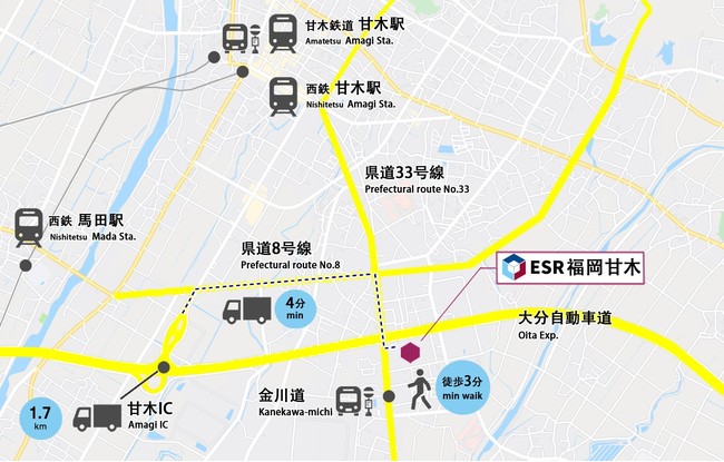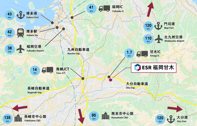 ESR株式会社(代表取締役:スチュアート・ギブソン、本社:東京都港区 以下、ESR)は福岡県朝倉市一木の大分自動車道および県道33号線沿いに、ESRとして九州地方初進出となる「ESR福岡甘木ディストリビューションセンター」(以下、福岡甘木DC)を開発することをお知らせいたします。