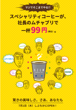 スペシャリティコーヒーが社長のムチャブリで衝撃の99円に! 完全キャッシュレスカフェ、『AZLM CONNECTED CAFE 渋谷地下街店』7月1日(木)渋谷にオープン!