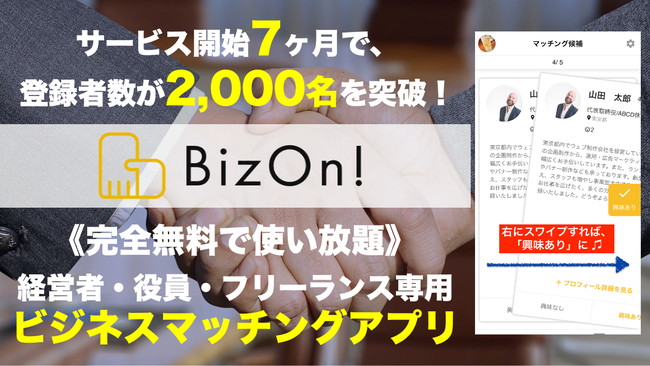 経営者・フリーランス限定ビジネスマッチングアプリ「BizOn!」(ビズオン)が、累計登録者数2,000人を突破しました!